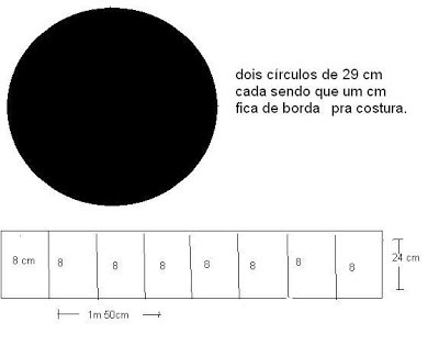 Para começar, corte uma faixa de tecido com altura de 24 cm e 1m 50 cm de comprimento e dois círculos medido 29 cm cada. Faça 14 pregas a cada 8 cm (lembrando que todas essas medidas são adaptáveis para mais ou para menos). Marque cada prega com o ferro quente e alfinete em cima e embaixo a cada prega.