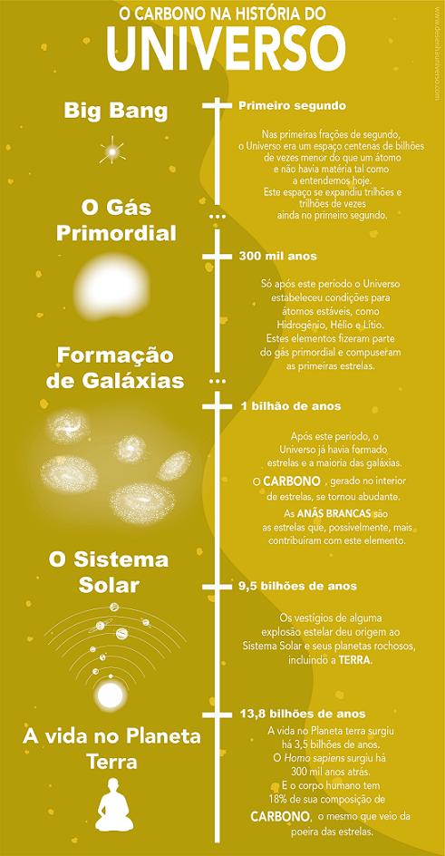 O carbono é um dos elementos mais abundantes do universo e surgiu a partir de estrelas há bilhões de anos atrás. Daí vem a célebre frase “Somos feitos de poeira de estrelas”, atribuída a Carl Sagan. Este elemento tem propriedades que o fazem perfeito para a vida, pois suas ligações químicas permitem uma ampla variedade de combinações com outros átomos.