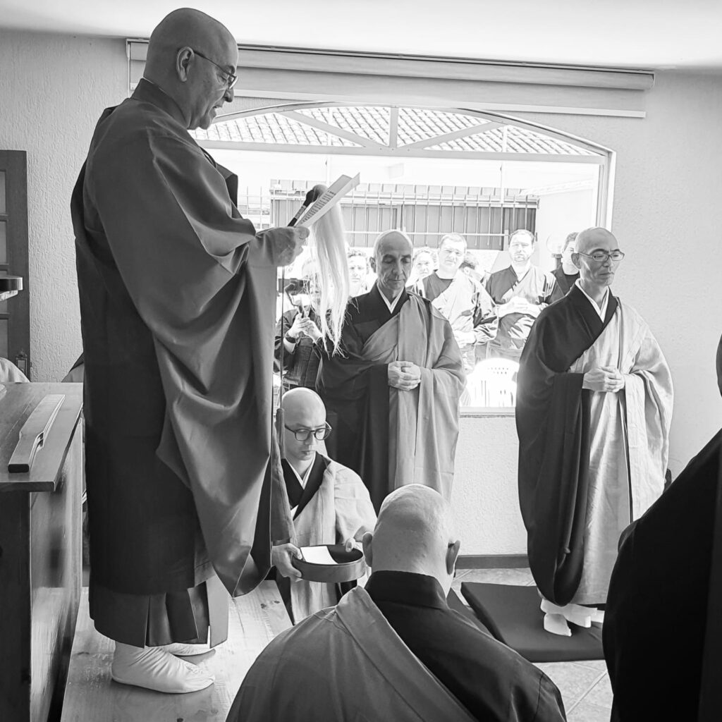 Durante os ensaios, Genshō sensei, nos momentos em que proferiria algum discurso na cerimônia oficial (na qual, subindo a montanha do Dharma, se tornaria o abade do templo), repetia as frases “palavras do Dharma” ou “palavras de agradecimento”, para marcar o que aconteceria àquela altura. No momento da cerimônia real, as verdadeiras palavras do Dharma fluíram naquela manhã quente em Florianópolis. Emocionadas e emocionantes, eram o rugir do leão, eram a soma da carga histórica e espiritual dos patriarcas tomando o lugar do indivíduo.