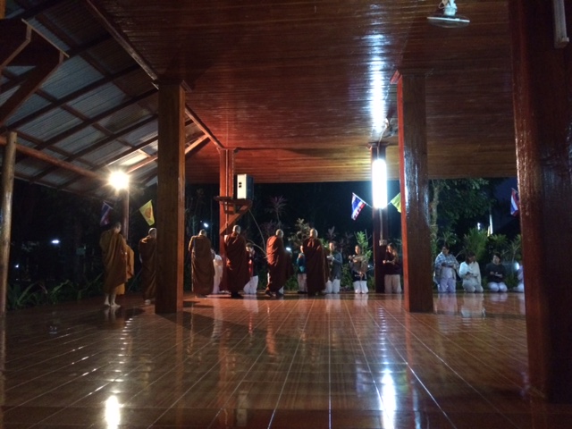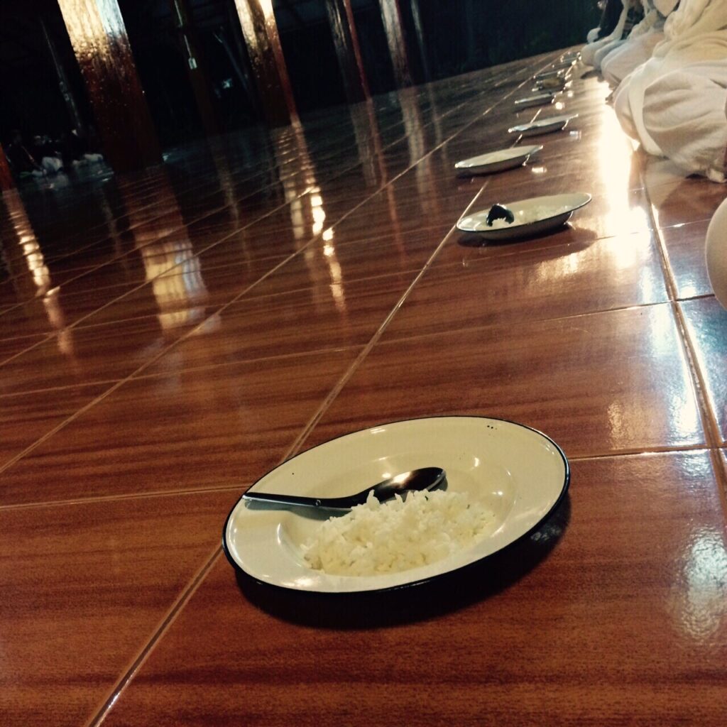 Em um dos primeiros mosteiros Theravada com que me identifiquei, levantávamo-nos às 5h para meditação individual nos kutis, mas às 6h30 estávamos já servindo arroz aos monges. No início só pensava no tanto de arroz frio que eles tinham que comer – já que todos praticantes e visitantes se alinhavam para colocar um pouco de comida na tigela de cada um dos monásticos e, às vezes, esse processo levava mais de 30 minutos. Depois, o almoço me parecia ainda menos lógico. Formavam-se fileiras de no máximo quatro pessoas, e uma a uma, nos dirigíamos até os monges a quem oferecíamos as bandejas com as comidas. Ao final, ainda, o abade do templo fazia um pequeno discurso de agradecimento permeado por lições do Dharma que tornava todo o processo ainda mais demorado. Tanto no almoço quanto no café da manhã, a nossa comida esperava por nós nas panelas, de forma que somente os monges eram os que comiam tudo frio. À época, eu só pensava em mudanças que eu poderia fazer àquela organização para deixar tudo “menos enrolação” e mais agradável para todos – segundo minha logística.