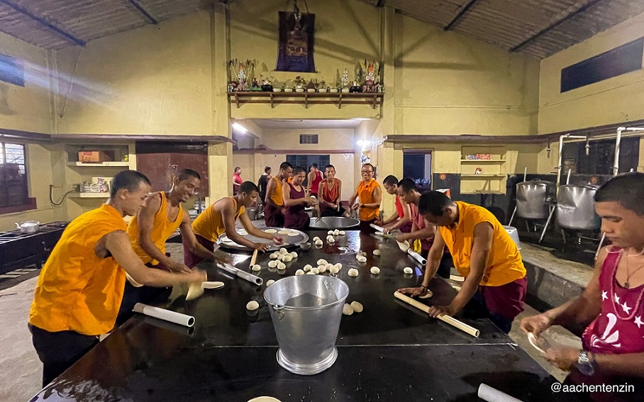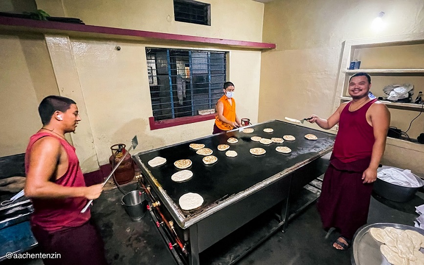 Ven. Aachen – Comemos comida muito simples. Aqui no mosteiro temos duas cozinhas principais, uma para a escola e outra para o instituto. Os alimentos são iguais em ambas as cozinhas. Para o café da manhã, a tradicional farinha de trigo frita tibetana chamada (tsam pa) com chá de manteiga e pão, e é servida às 7h. Para o almoço, comida tradicional indiana; arroz, dal com curry, servido às 11h00. O chá da tarde é servido às 15h, seguido do jantar às 18h. Arroz e curry ou (thuk pa) macarrão tibetano são servidos no jantar.