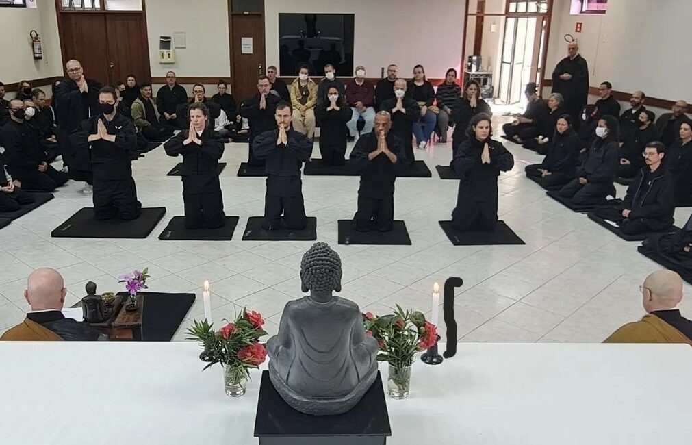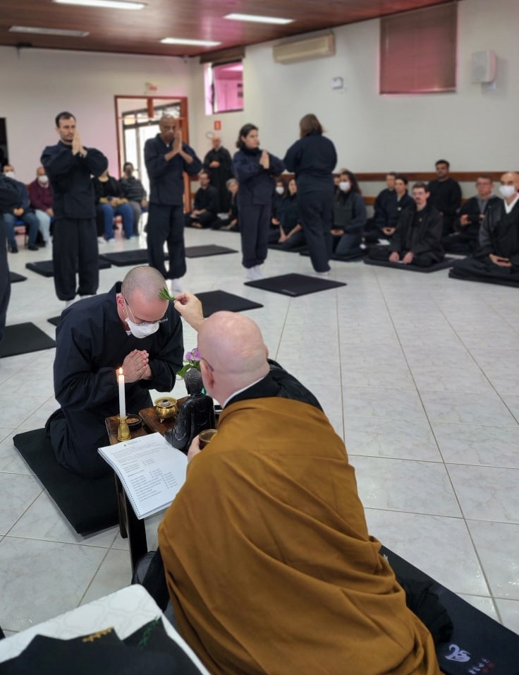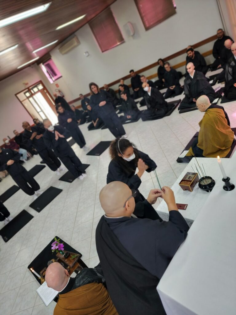 Enfileirados, via a sangha, meus irmãos e irmãs, filhos e filhas, assistindo ao cumprimento do Dharma que saía das mãos do nosso mestre.
