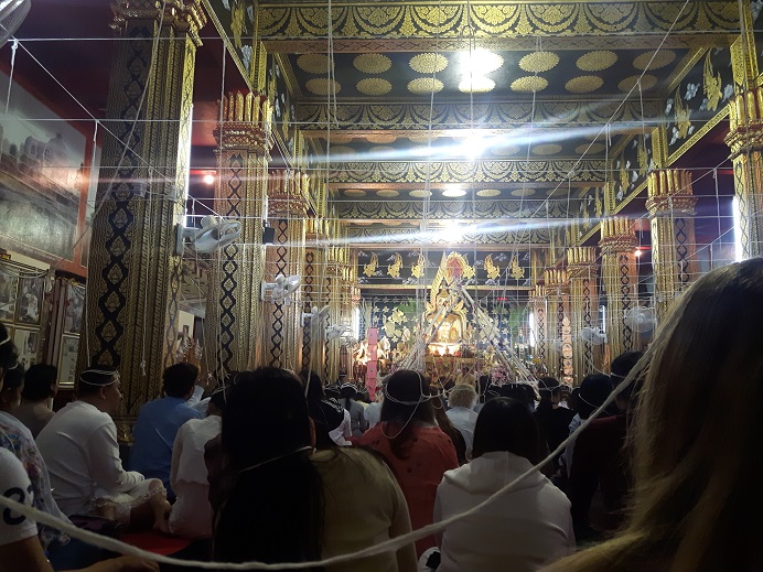 Uns 6 anos depois, nessas viradas de calendário, estaríamos com minha sogra em um templo no norte da Tailândia, enrolando barbante[4] em nossas cabeças que se estenderiam às cabeças de outros desconhecidos, formando uma teia rizomática que enveloparia o templo todo ao som dos sutras em pali entoados como cânticos que, à altura, já nos eram tão conhecidos quanto “adeus ano velho e feliz ano novo”. Aquele emaranhado de fios, para mim, eram as gotas do mar, que ali, todos juntos, mostravam-nos que éramos o mesmo oceano.
