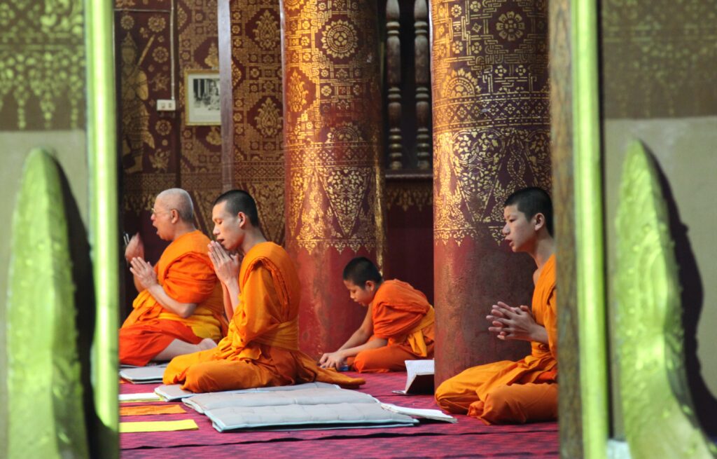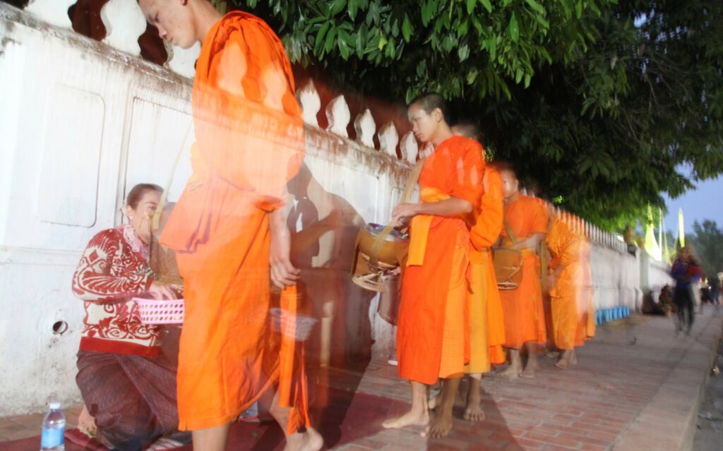 Todos os dias, ainda antes do amanhecer, os monges percorrem as ruas esmolando alimento. A tradição que remete ao tempo do Buddha histórico cria uma conexão muito estreita entre leigos e comunidade monástica. Um monge nos explicou que não é ele, o indivíduo, que recebe o alimento, mas a sangha e que não é em frente a ele que os leigos se ajoelham quando fazem sua oferta, mas aos discípulos de Buddha como um todo.