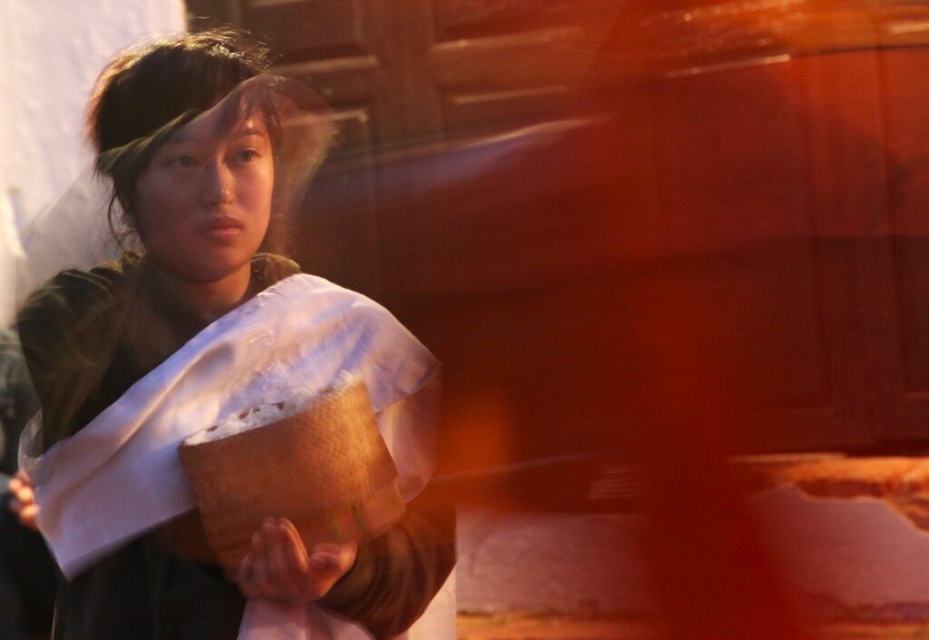 As ruas levemente iluminadas pelas lâmpadas amareladas recebem filas de mantos açafrão e o ar fresco se enche com os cânticos. Uma após a outra as tigelas ficam cheias e os moradores recolhem suas panelas e cestos vazios, onde trouxeram as ofertas, e voltam para suas casas dando início a mais um dia.