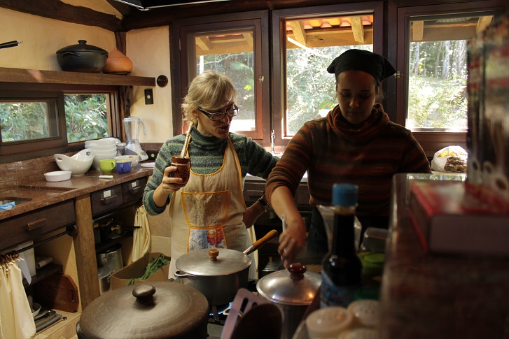 Enquanto os praticantes sentam-se em zazen, a cozinha trabalha, mentes vazias, panelas borbulhantes; sentados nos zafus com joelhos fincados no chão, os alunos só têm as paredes brancas, já na cozinha as cores saltam aos olhos e aromas preenchem espaços.