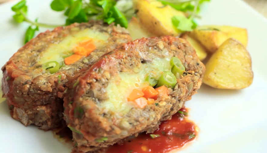 Dê 2cm de distância da borda e distribua uma camada de purê. Disponha a vagem e a cenoura sobre ele e em seguida enrole o rocambole. Procure deixar o rocambole bem firme, e para isso aperte bem.